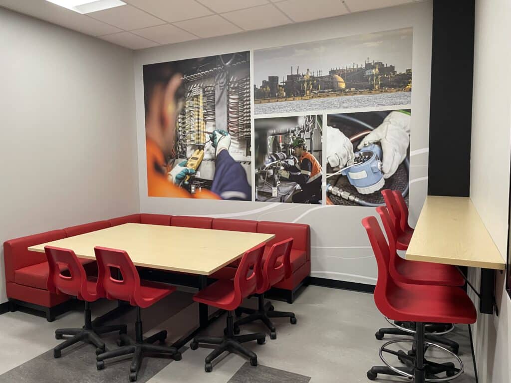 Ainsi, grâce à ce partenariat, le salon est maintenant pourvu d’un ameublement adapté aux besoins des étudiant.es, dont notamment, de jolis fauteuils, une bibliothèque, un module micro-ondes. Une magnifique fresque orne la quasi-totalité d’un des murs et se compose de photos représentant des employés de RTFT à l’action. On peut, entre autres, y observer une vue panoramique de l’entreprise aux abords de la rivière Richelieu.