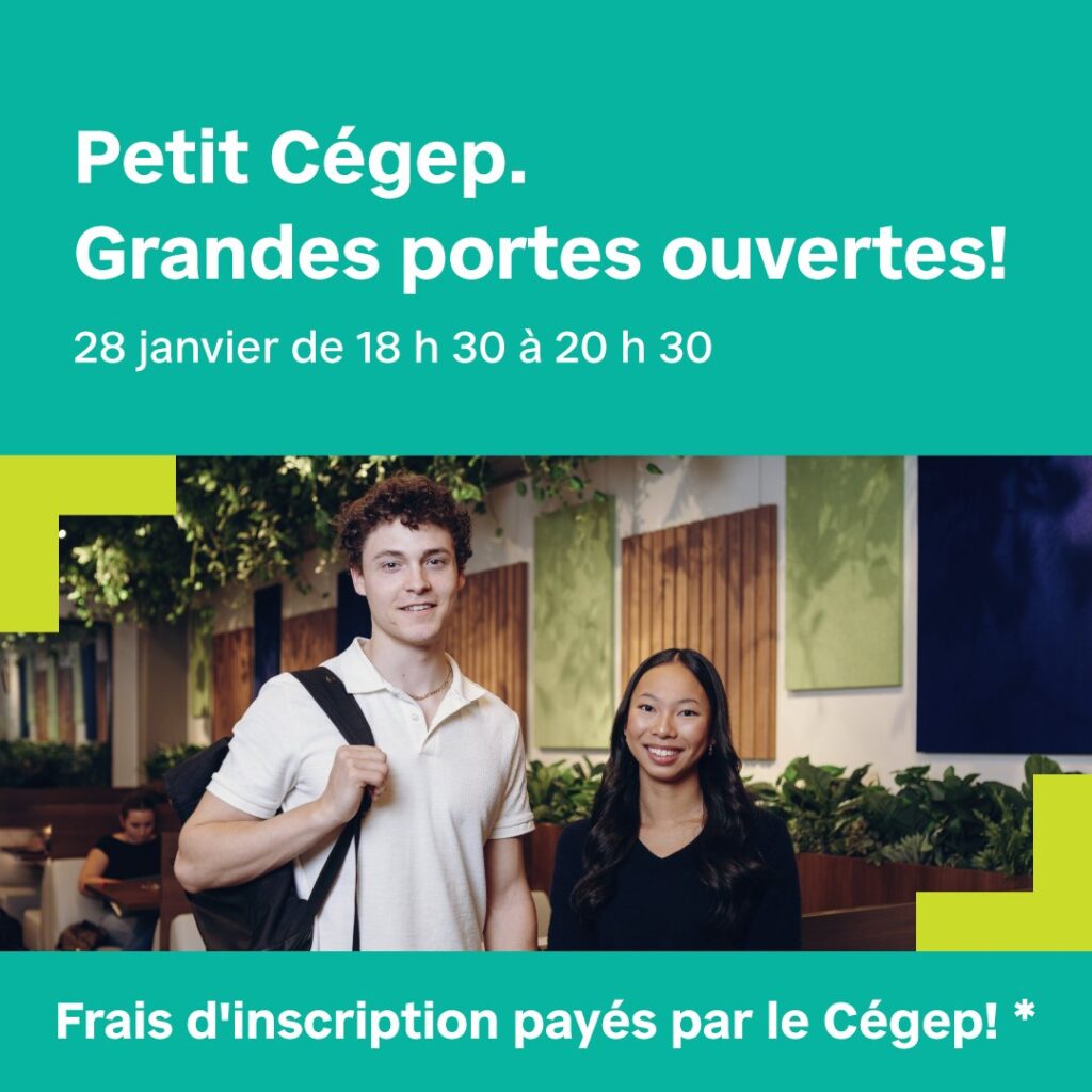 La deuxième édition des Portes ouvertes se tiendra le mercredi 28 janvier de 18 h 30 à 20 h 30. Pour la deuxième année consécutive, le Cégep assumera les frais d’inscription au Service régional d’admission du Montréal métropolitain (SRAM) pour les personnes qui s’inscriront directement sur place, lors de leur visite, le soir même.