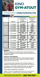 Vous désirez retrouver la forme, améliorer votre condition physique ou maintenir votre pratique quotidienne d’activité physique? Joignez-vous au Kino Gym-Atout dès maintenant et profitez de nombreux services offerts à nos membres dans un cadre sécuritaire, accueillant et professionnel.