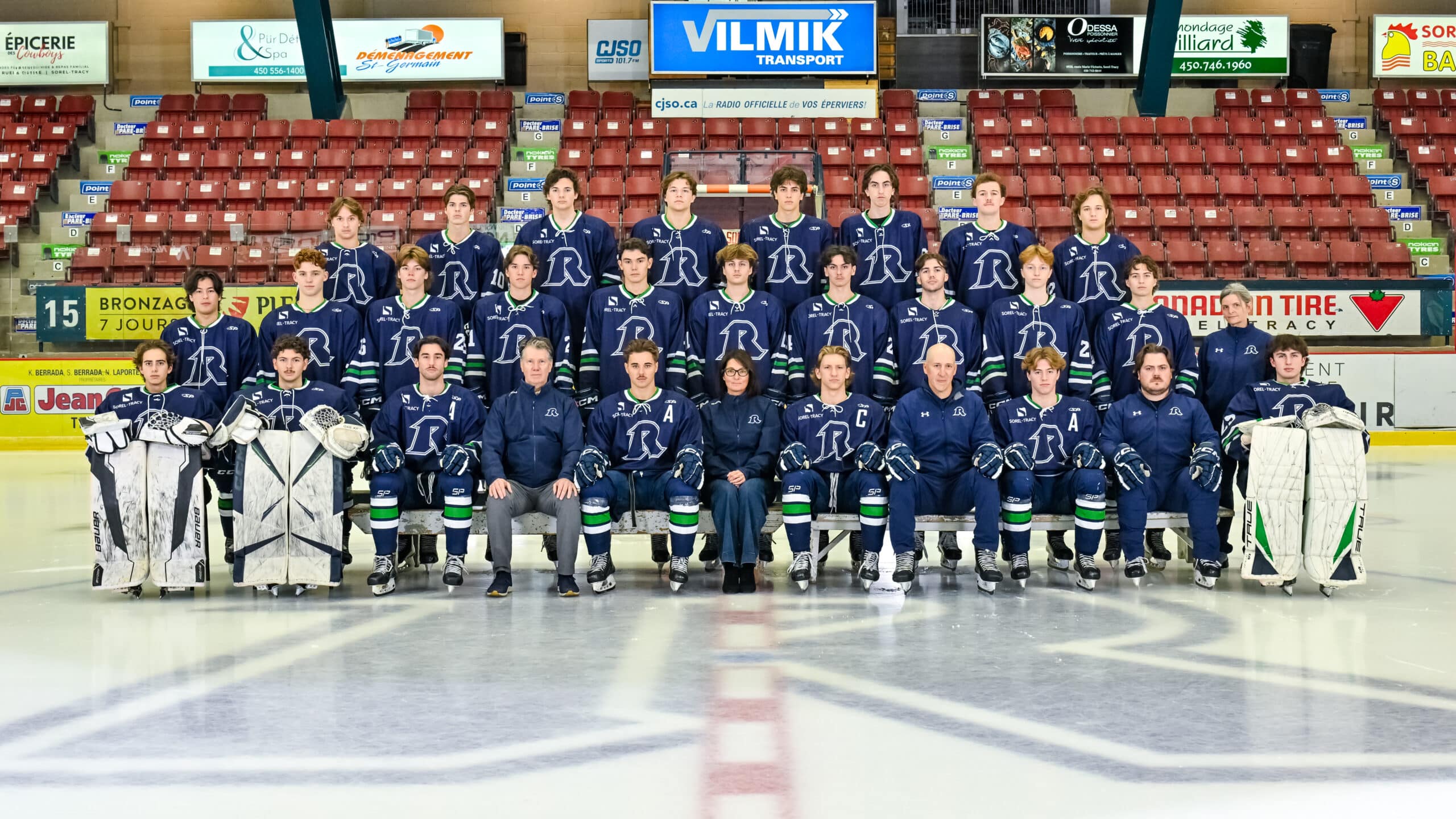 31-Étienne L’Espérance, 30-Justin Roux, 9-Jules Lampron (A), Richard Farley (responsable du programme hockey), 18-Louis Dumoulin (A), Diane Dumas (directrice générale), 19-Éliot Lahaie (C), Éric Messier (entraîneur-chef), 27-Justin Guilbault (A), Marc-Antoine Guimond (entraîneur-adjoint) et 29-Charles-Antoine Bolduc